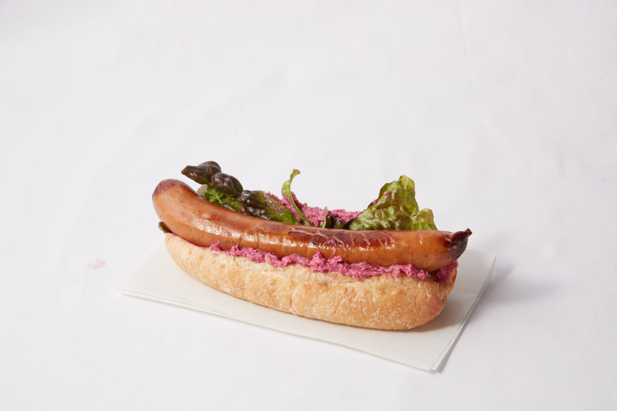 ピンク色のビーツを使用したバターが色鮮やかな、あらびきフランクフルトを使ったホットドック。