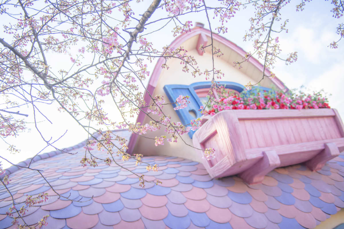 東京ディズニーランド®のトゥーンタウンにある「ミニーの家」の横で開花したのは、カワヅザクラ(河津桜)。
