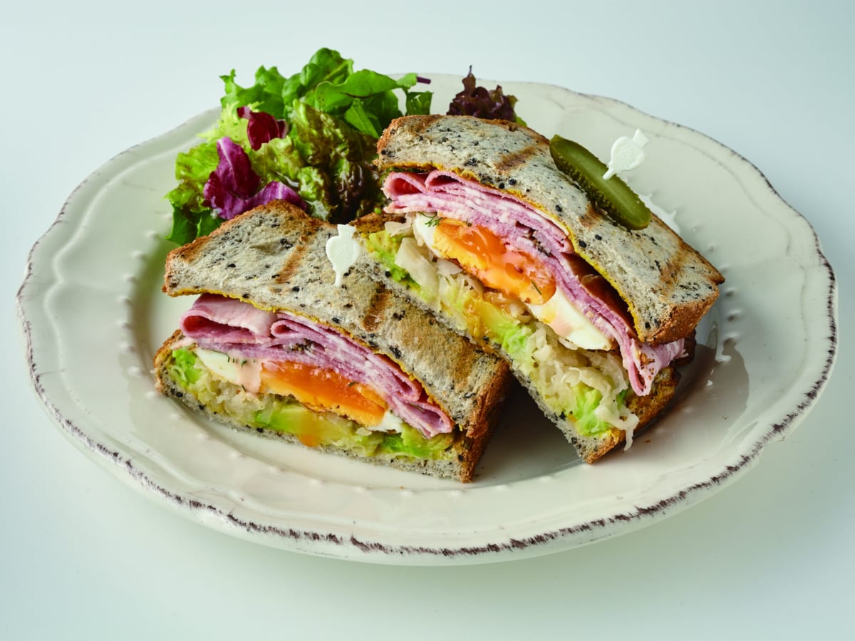 ザワークラフト、ディルをセサミブレッドでサンドしてあり、マスタードの爽やかな酸味が味のアクセント。