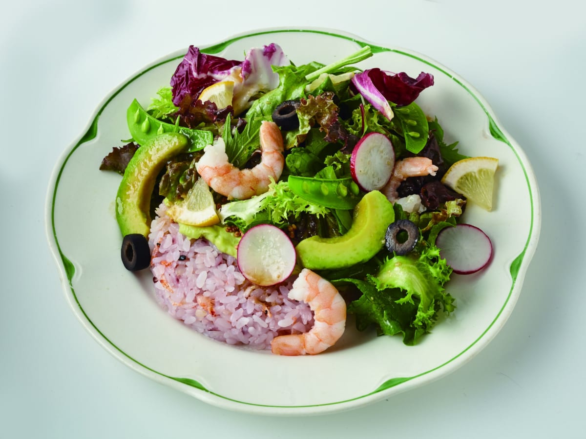 桜海老とビネガーを混ぜた13穀米ごはんに、海老、アボカド、グリーンサラダを添え、アボカドのディップ、アンチョビわさびドレッシングが美味しさを引き立てます。