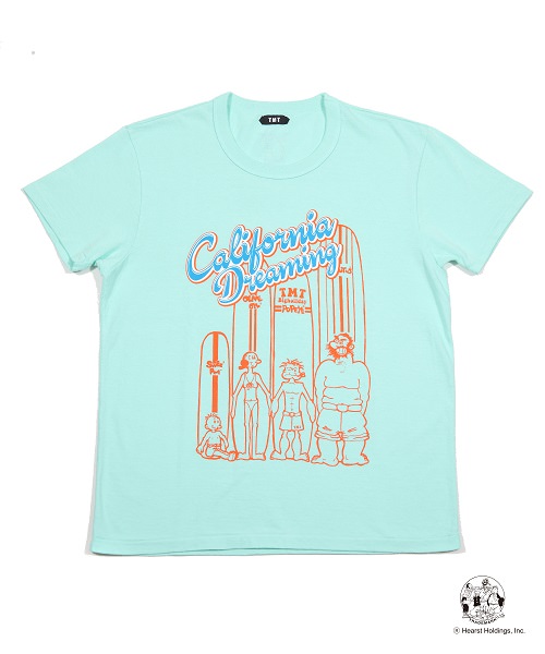 『ポパイ(R)』に登場するキャラクターたちがサーフボードをバックに並んでいるTMTオリジナルグラフィックがフロントに配置されたTシャツ。