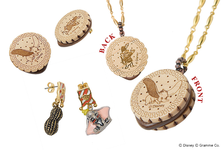 「ダンボ」と「ティモシー」が表と裏に描かれた2Wayのビスケットネックレスや、「ティモシー」の好物であるピーナッツと「ダンボ」がセットになった、親友である2人の仲の良さを感じられるピアス、