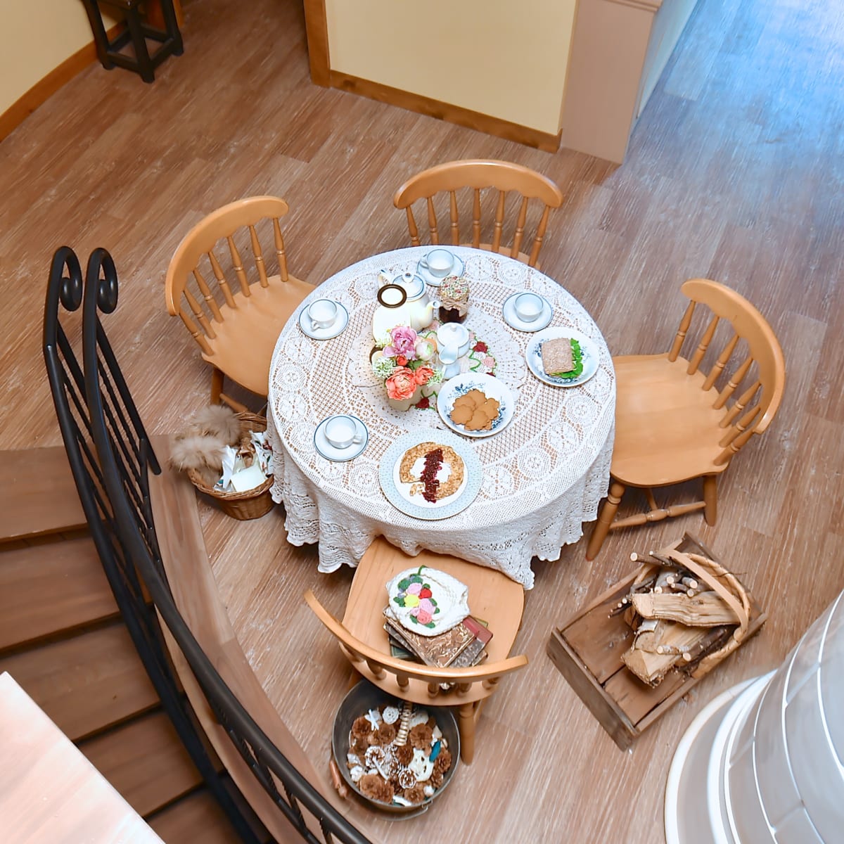 ダイニングテーブルの様子から、ムーミンたちの楽しい食事のシーンが目に浮かびますね!