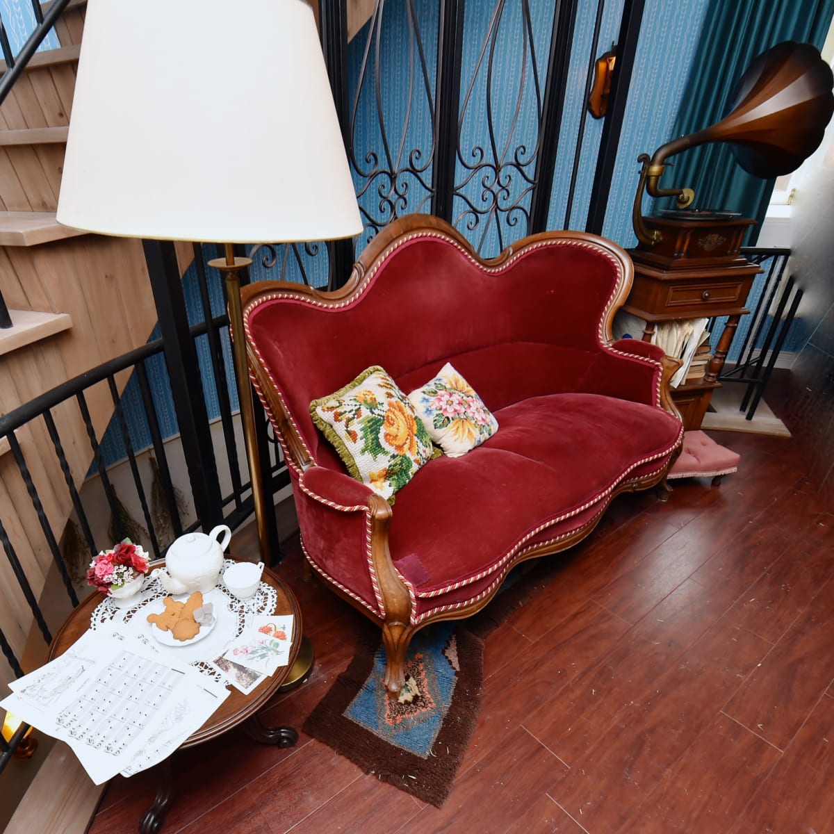 ふかふかのソファーと蓄音機、サイドテーブルが置かれています。