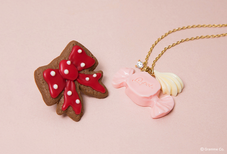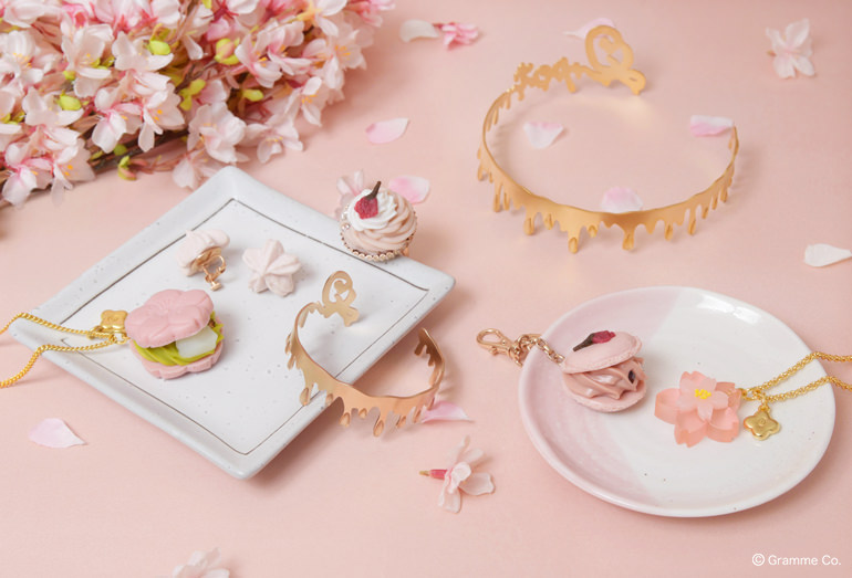 さくらもなか ネックレス 8,000円(税抜)、サクサクサクライヤリング(セット) 6,000円(税抜)、サクラモンブランリング 5,800円(税抜)、メルティーバングル 5,200円(税抜)、チョーカー 8,400円(税抜)、サクラマカロンバッグチャーム 6,400円(税抜)、桜羊羹 ネックレス 9,000円(税抜)