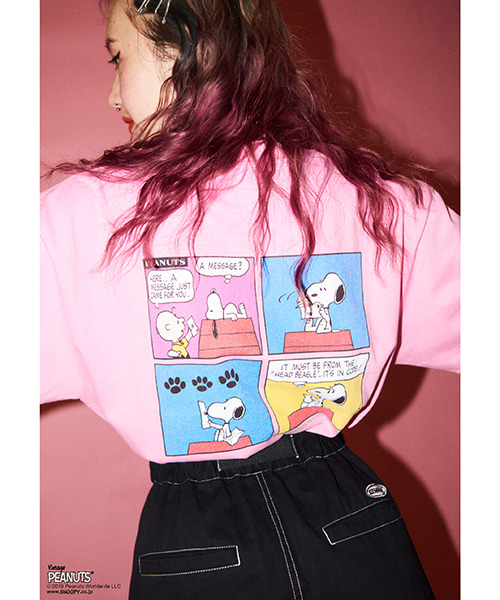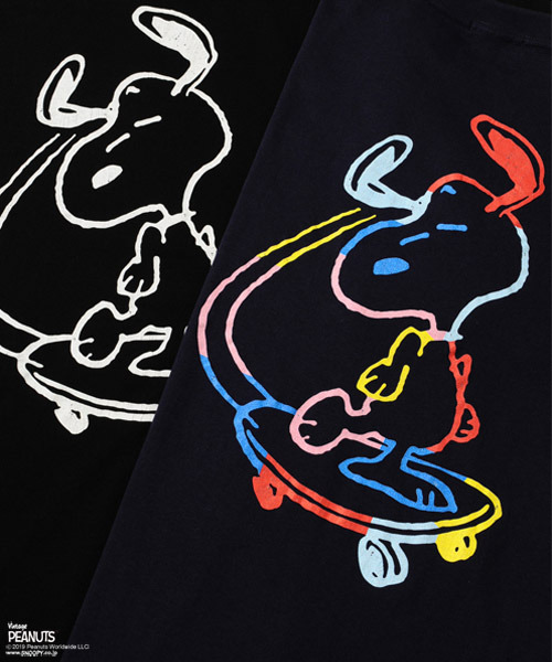 ラフなタッチで描かれたバックスタイルのスケーター風「スヌーピー」が可愛いTシャツ。
