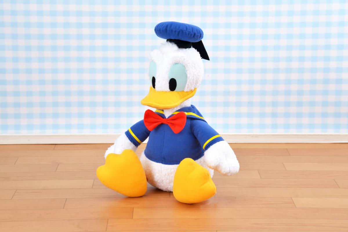 ふわふわ生地で思わず触りたくなる「ドナルドダック」のぬいぐるみ。
