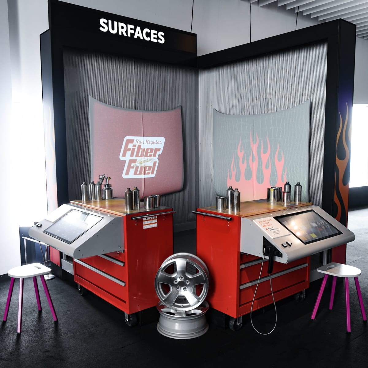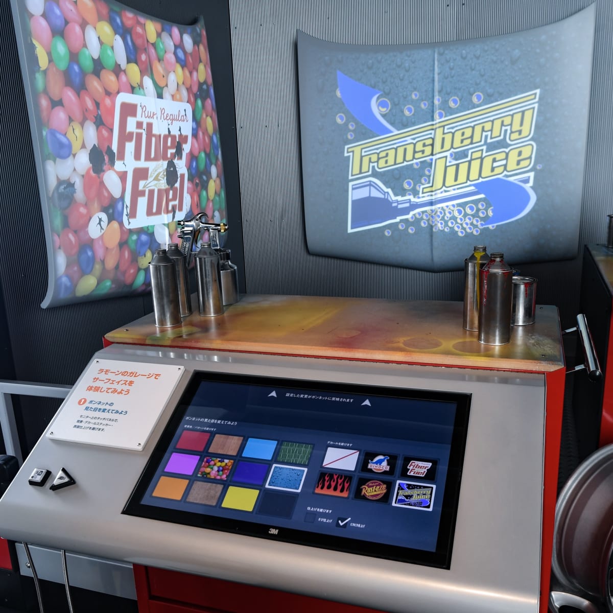 『カーズ』シリーズをモチーフに、ボンネットのカラーや柄、そして光沢感や錆びなどのテクスチャを変えて、印象の違いを体感することができます。