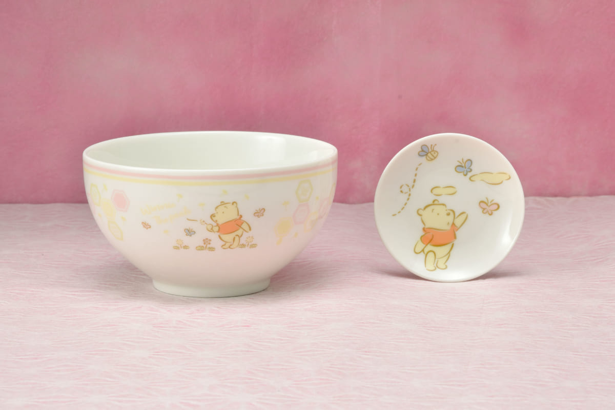 「くまのプーさん」の可愛いイラストがプリントされたどんぶりと小皿。