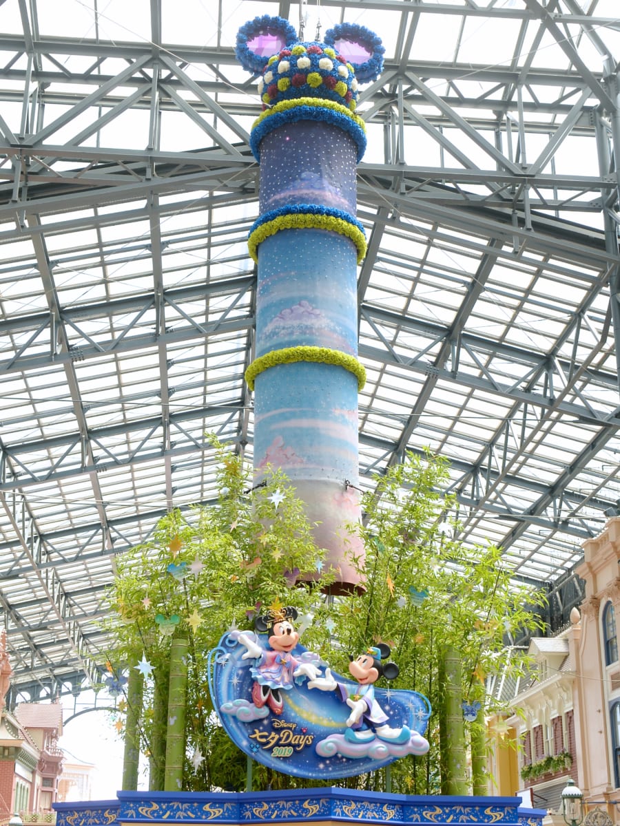 東京ディズニーランドのワールドバザール中央には、ミッキーマウスとミニーマウスのレリーフを中心に吹き流しや笹が飾られた“ウィッシングプレイス”が登場!