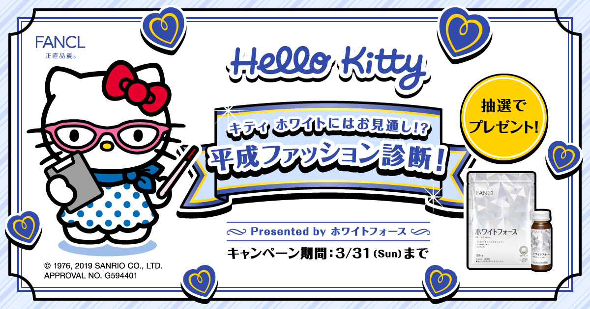 ファンケル「キティ ホワイトにはお見通し!? 平成ファッション診断!」は、2019年3月15日(金)から3月31日(日)の期間で開催です☆