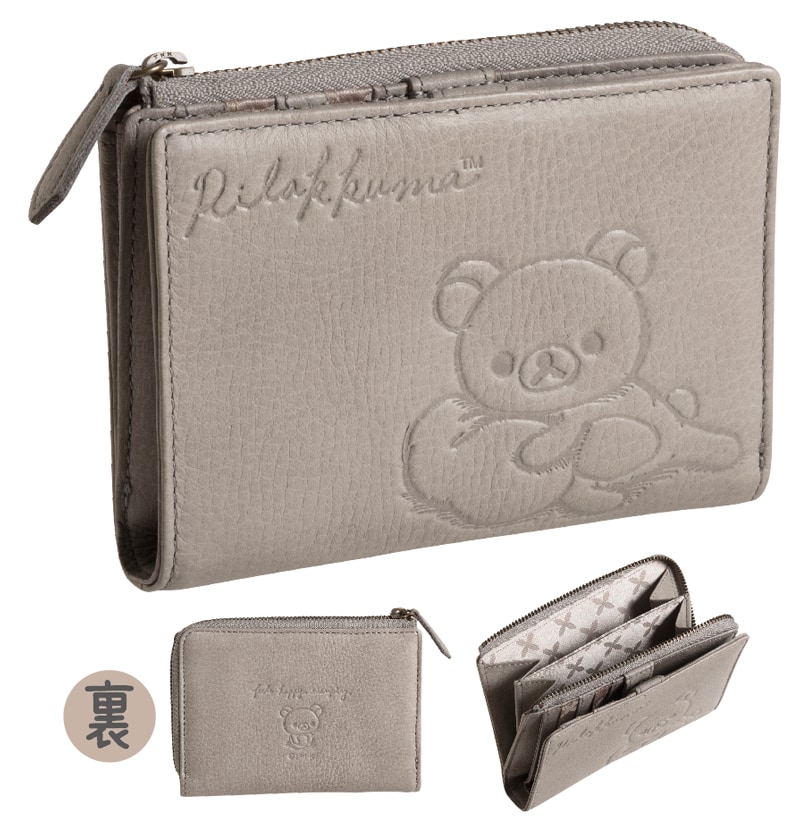上品なグレーカラーの本革にリラックマが型押しされた、ずっと使いたくなる本革小物です。