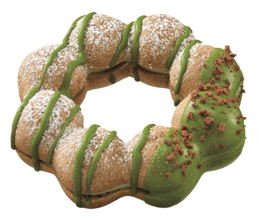 「ポン・デ・宇治抹茶マスカルポーネクリーム」は、祇園辻利の宇治抹茶を練り込んだポン・デ・リング生地に、なめらかなマスカルポーネチーズクリームをサンドした、まさに“和素材”と“洋素材”が組み合わせられたドーナツ。