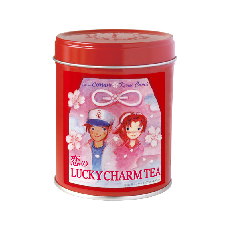 恋心を彷彿させる真っ赤な缶デザインが特徴の「服部平次&遠山和葉 恋のラッキーチャームティー 缶」