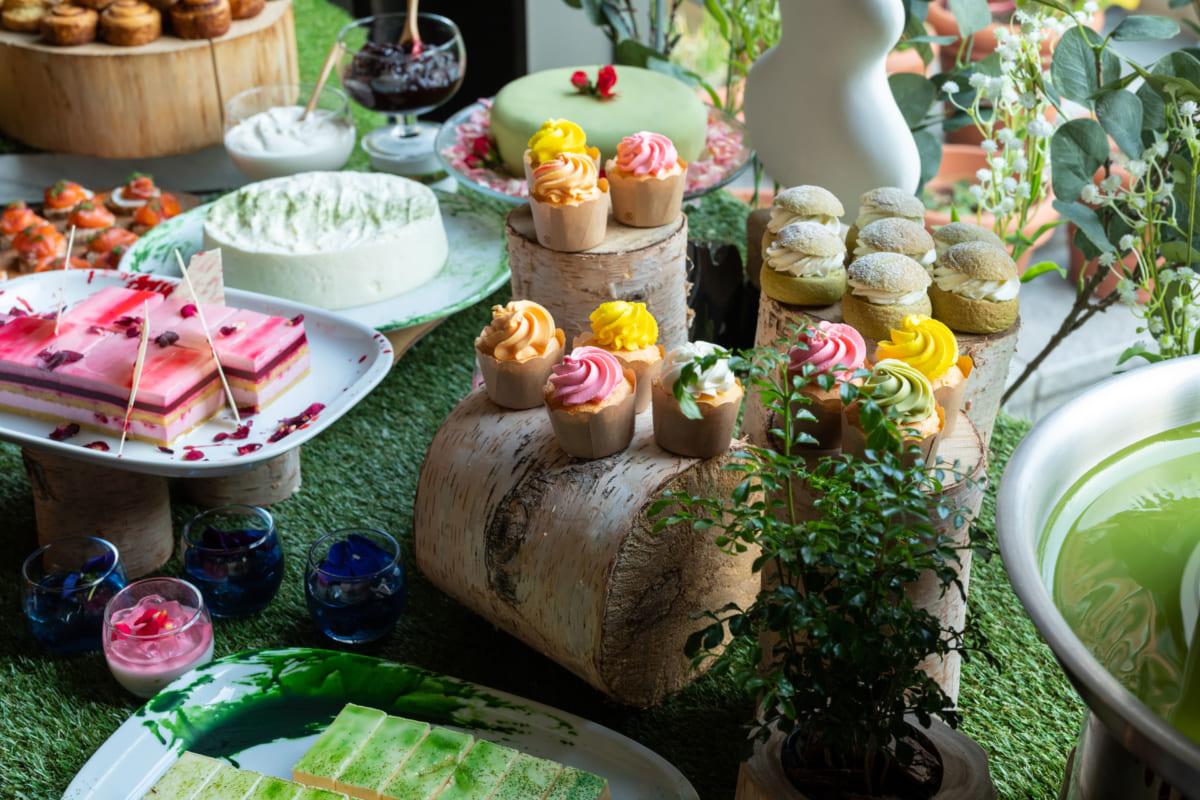 抹茶のセムラ、抹茶のクレームダンジュ、抹茶のティラミス、ショコラド ボラル、プリンセスケーキ、カップケーキ、ハイビスカスとベリーのタルト、ローズとラズベリーのムース、プレーンスコーン、ミニシナモンロール、抹茶ホワイトチョコレートファウンテン