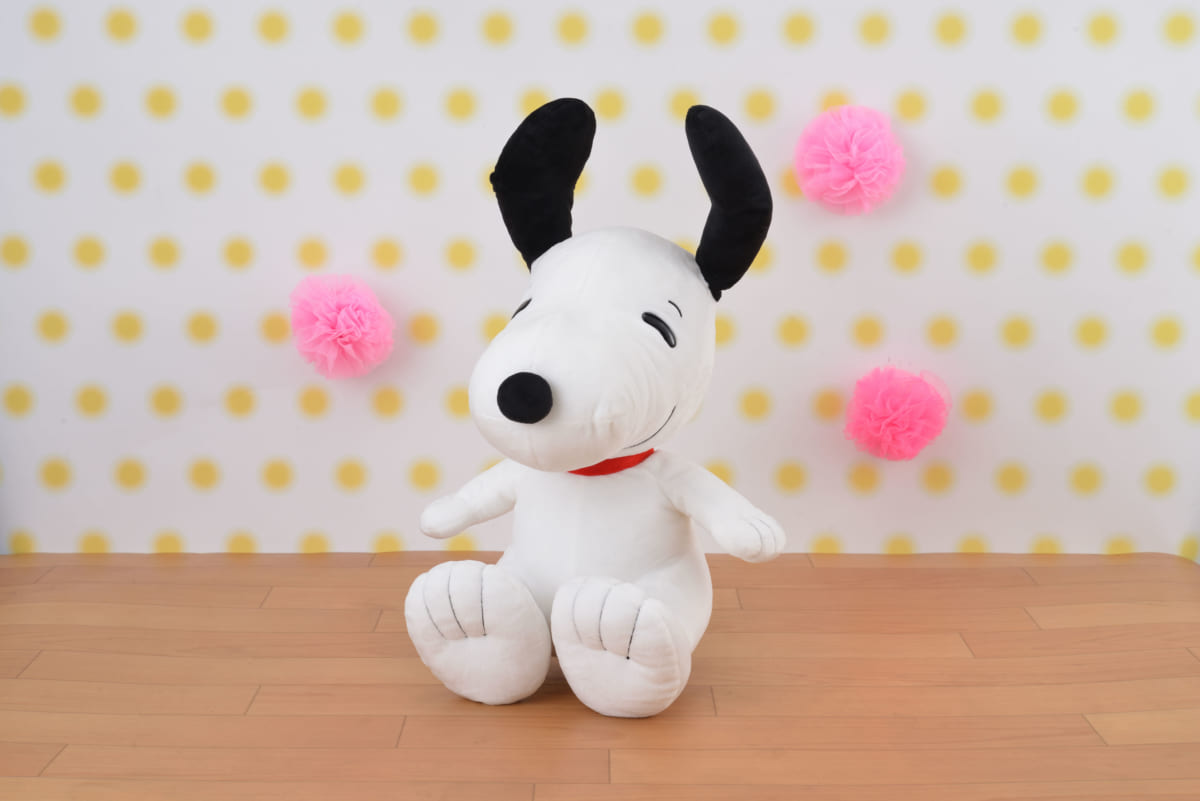 「スヌーピー」の寝そべりポーズのぬいぐるみ。
