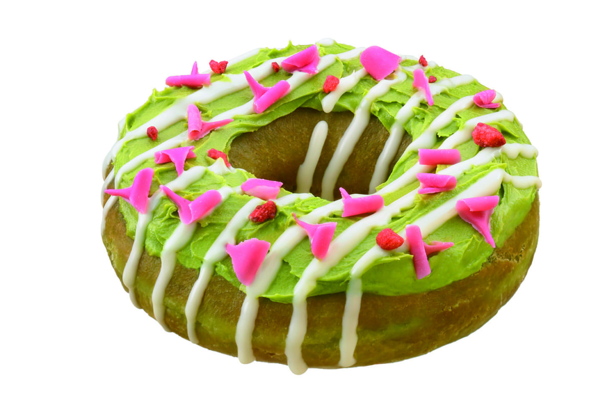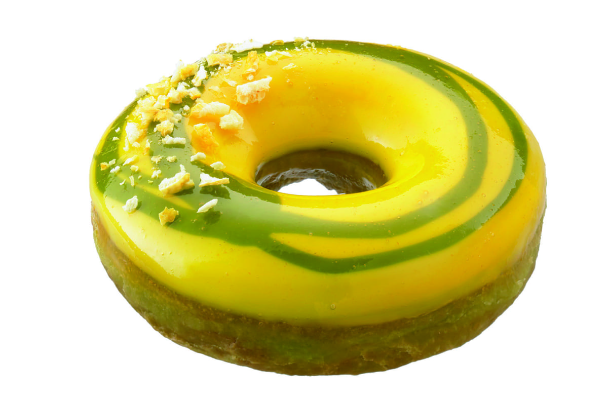 宇治抹茶の生地にミルキーなホワイトチョコを重ね、レモンとゆずのミックスナパージュをコーティングしたドーナツ。
