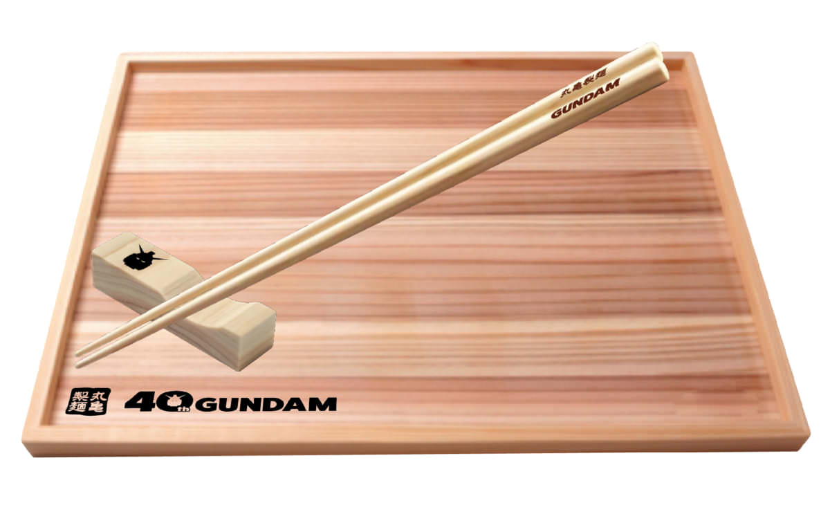 木目を活かしたお盆や箸置き、タイトルロゴ入りのお箸がセットになっています!