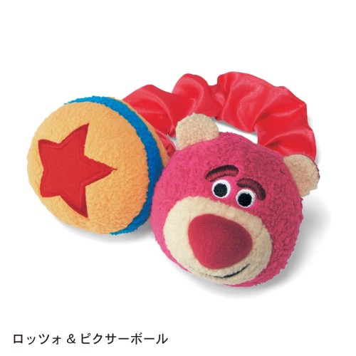 『トイ・ストーリー』に登場する「ロッツォ・ハグベア」と、ピクサーボール(ルクソーボール)のポンポンが付いたシュシュ。