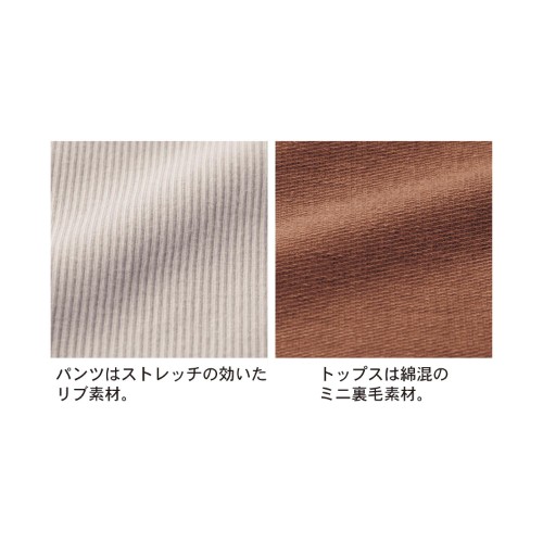 トップスには綿混のミニ裏毛素材を、パンツにはストレッチの効いたリブ素材を使用しています。
