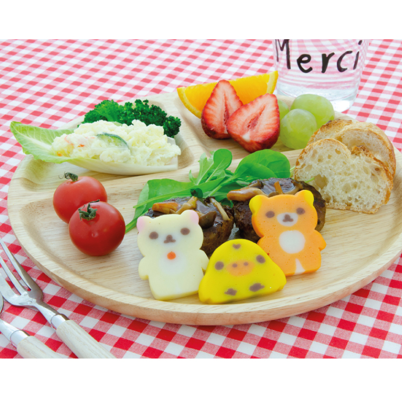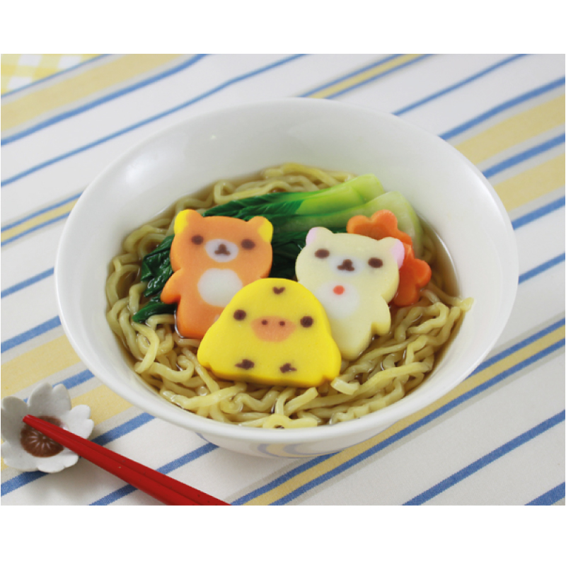 かわいいリラックマ、コリラックマ、キイロイトリの形をしたかまぼこ。