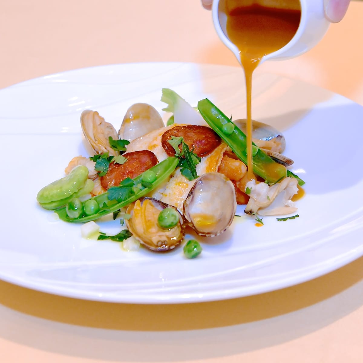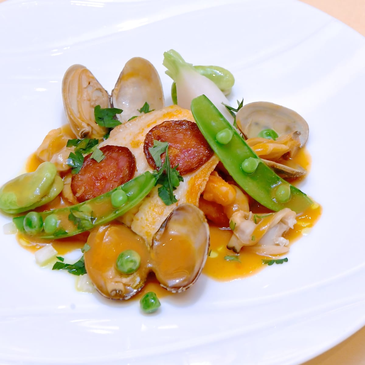 カレイのポワレ チョリソーのアクセント マンハッタン風クラムチャウダーソース