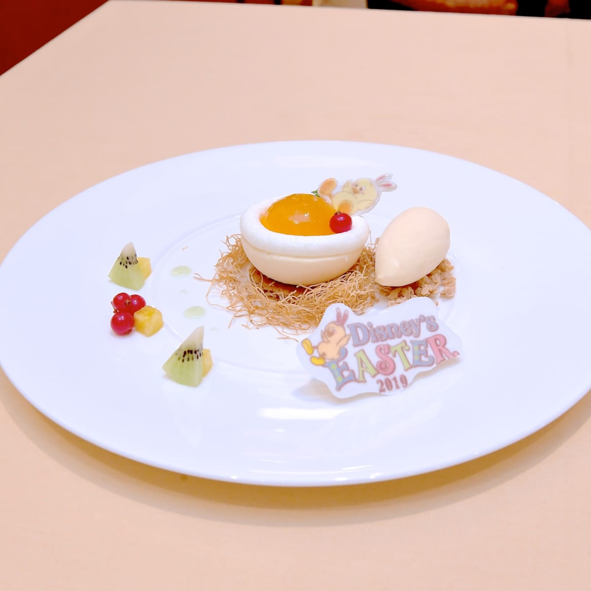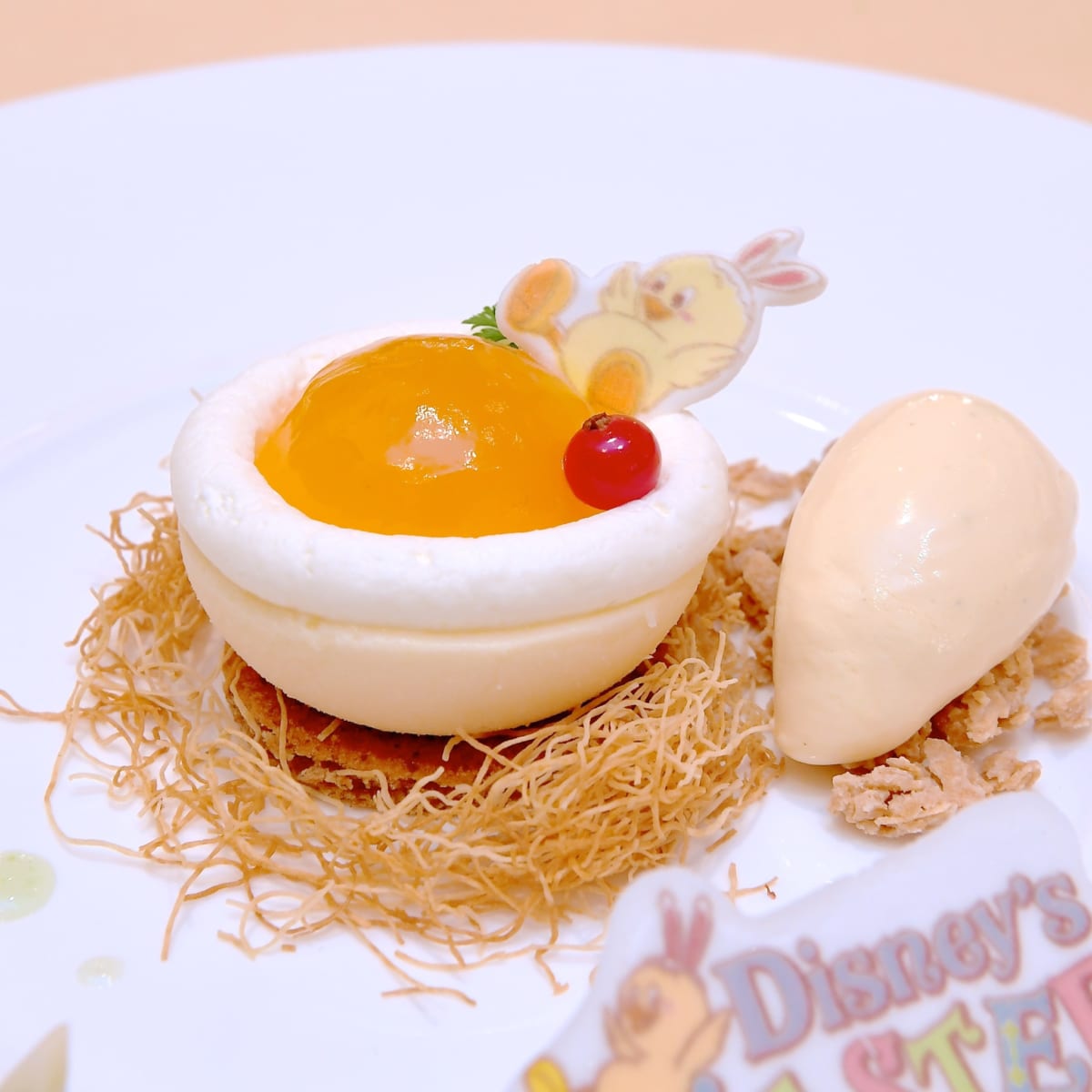 東京ディズニーシー“ディズニー・イースター2019”の新ショー『Tip-Topイースター』でも大活躍の“うさピヨ”の砂糖菓子が乗ったデザート。