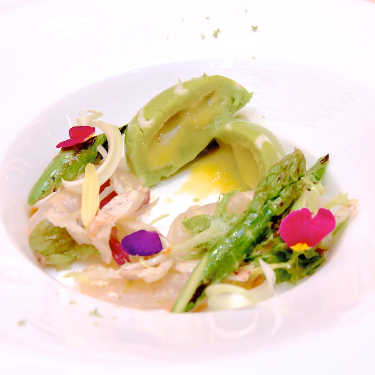 イースターエッグのような形のグリーンアスパラガスのババロアは、中にソースが隠れています☆