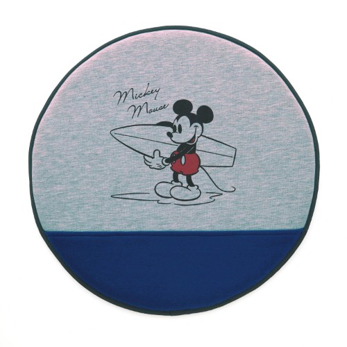 サーフボードを手に持った「ミッキーマウス」デザインのクッション。