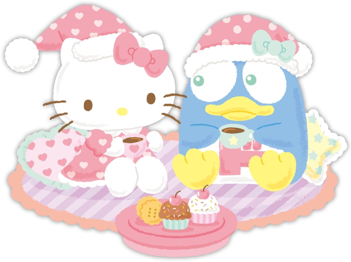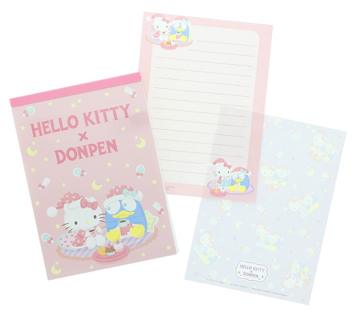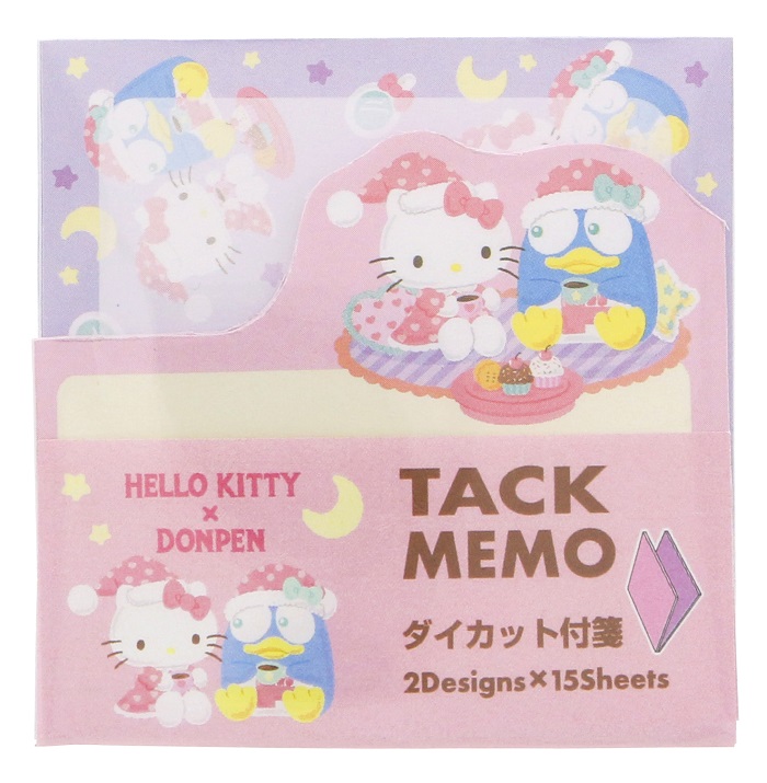 パジャマパーティーを楽しむ「ハローキティ」と「ドンペン」が描かれた、ダイカットタイプの付箋。