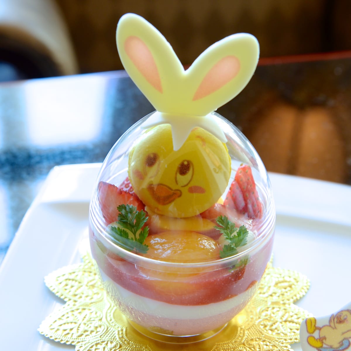 とろりとしたストロベリーのソースに、イースターエッグをイメージしたイチゴやメロン、アプリコット(あんず)などのフルーツも!