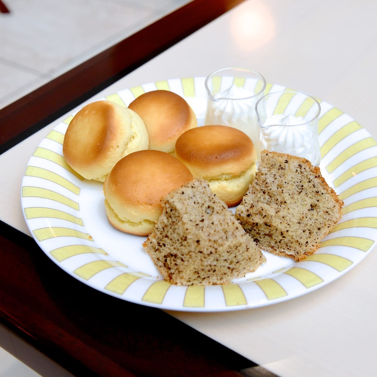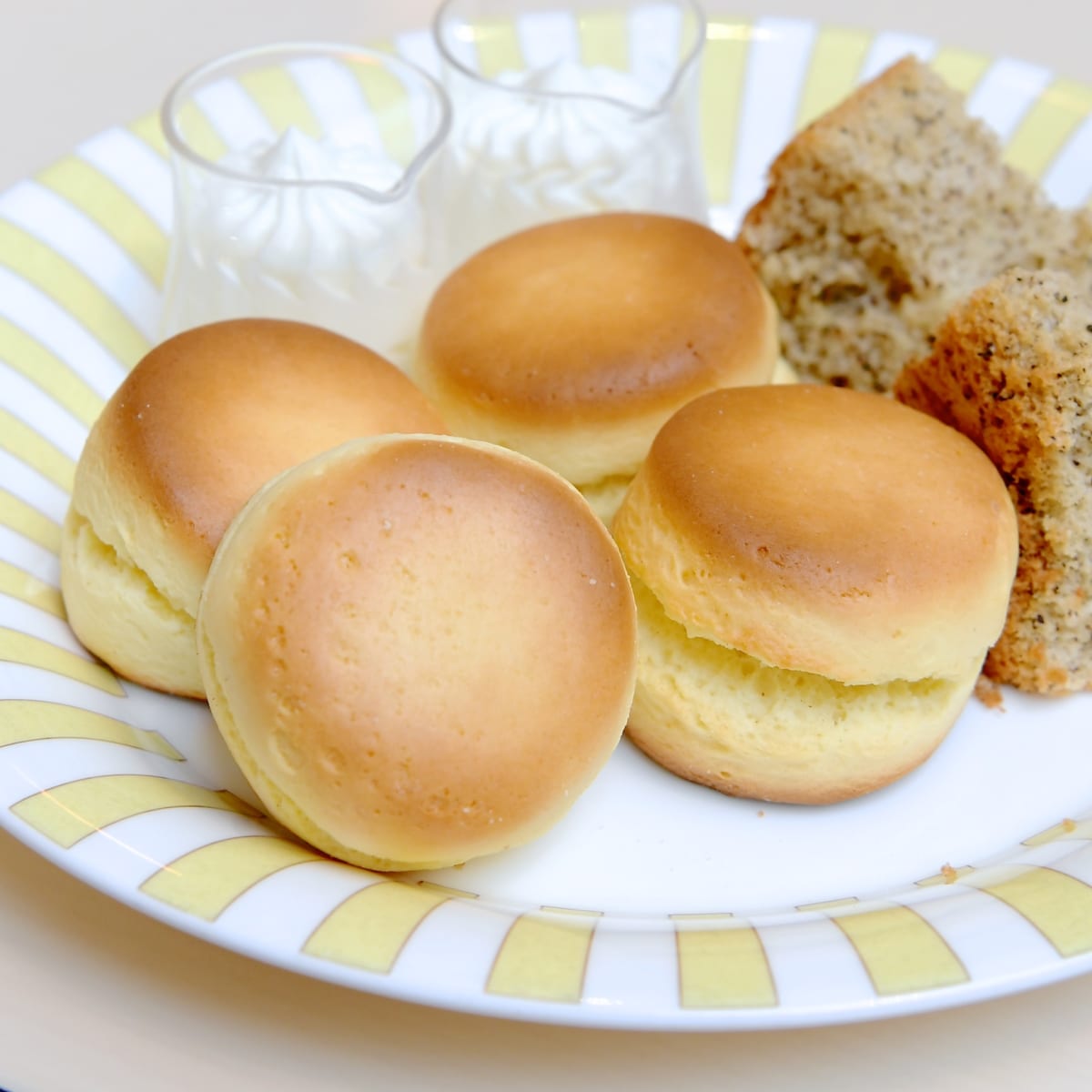 アフタヌーンティーの定番・スコーンはシフォンケーキと一緒に提供。