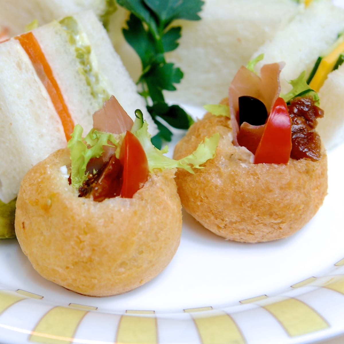 シュー生地の中にリコッタチーズとイチジク、トマト、生ハムなどをくわえて軽食風にアレンジ。