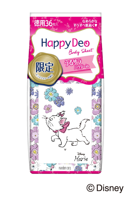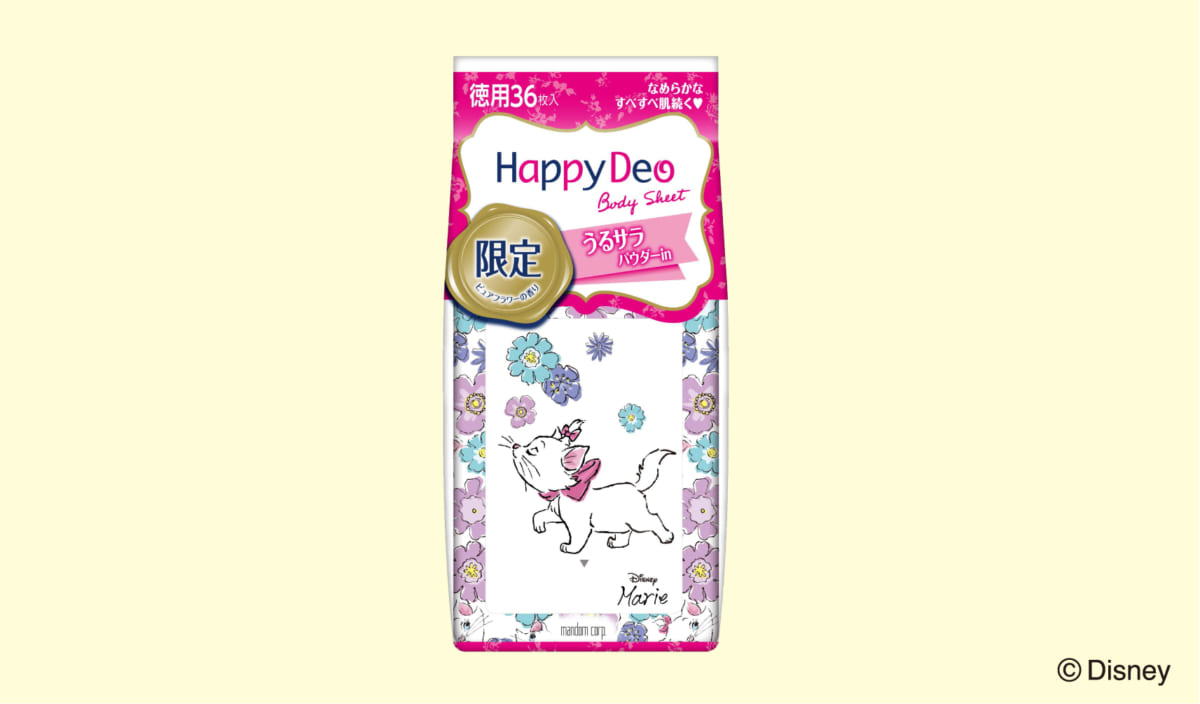 マンダムの「マンダム ハッピーデオシリーズ」より、2019年の限定商品としてディズニー映画『おしゃれキャット』の「マリー」をデザインした「マンダム ハッピーデオ ボディシート うるサラ ピュアフラワー」が登場。