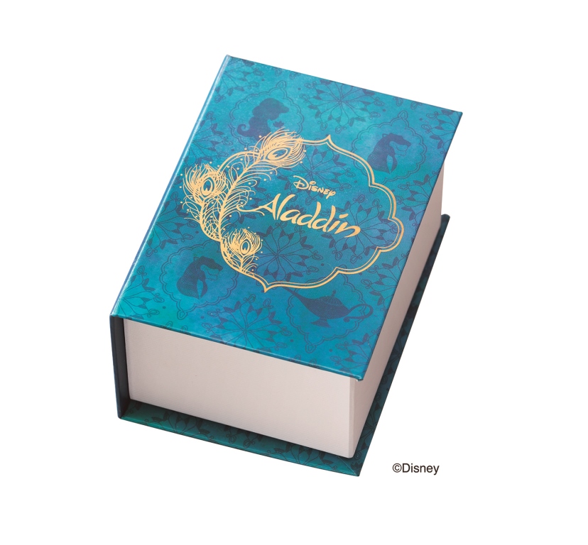 裏ぶたには、「アラジン」と「ジャスミン」が魔法のじゅうたんに乗って夜空を飛んでいるロマンチックなシーンを刻印しています。