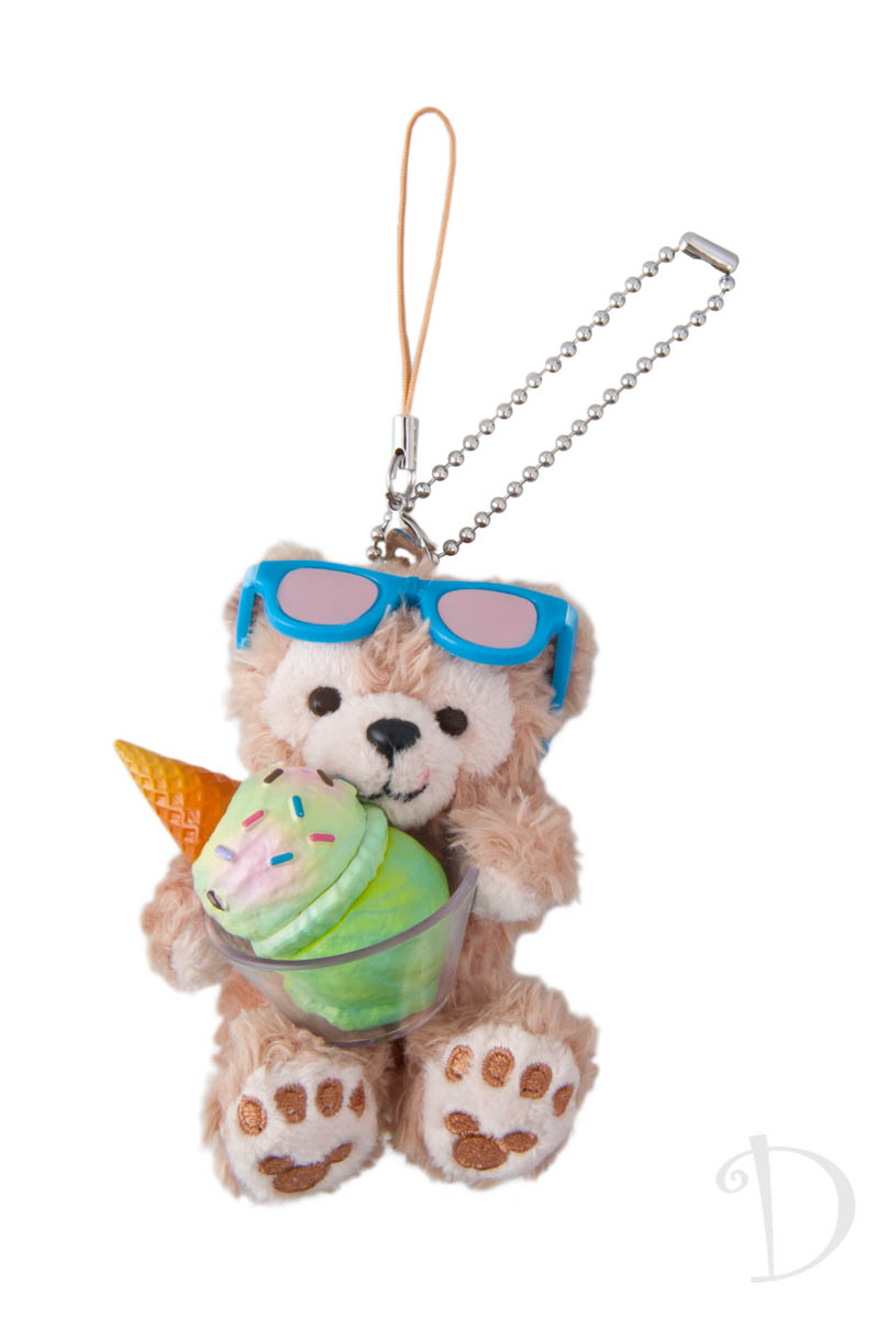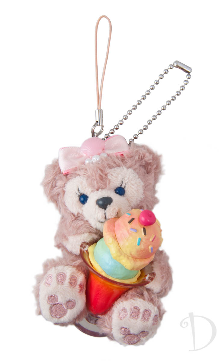 大きなアイスクリームやパフェと一緒のダッフィー&フレンズのぬいぐるみストラップ。