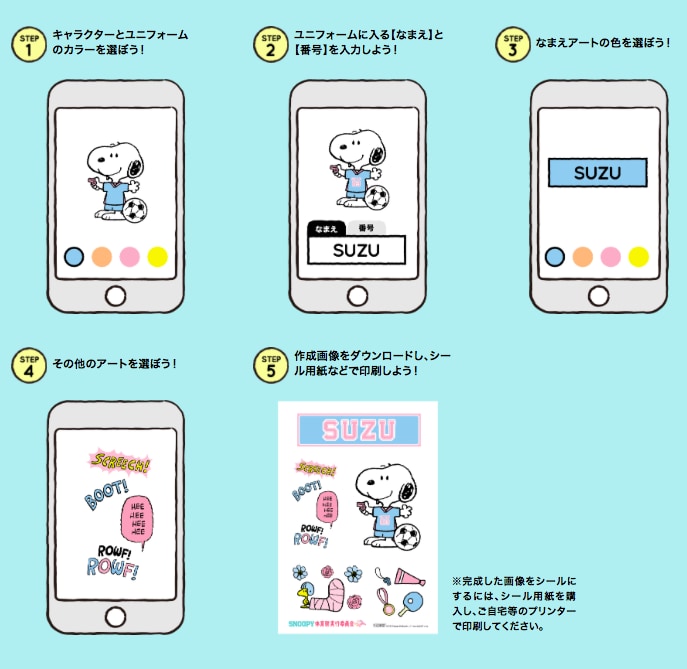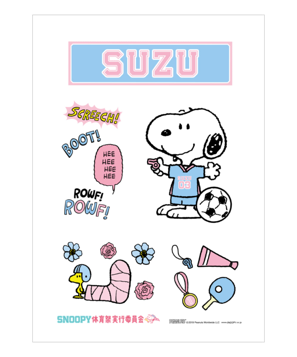 体育祭の応援グッズにスヌーピーの可愛いイラストと、自分の名前を入力してオリジナルデザインのスヌーピーたちの可愛い画像でシールを作れます!