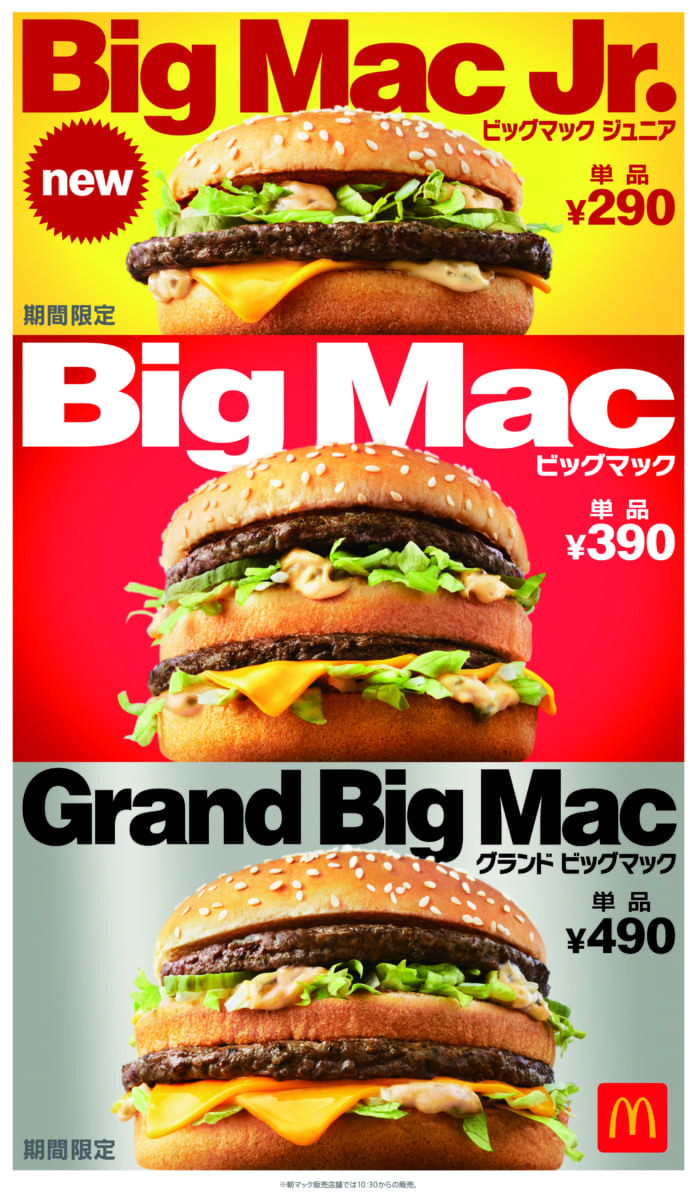 「ビッグマック ジュニア」と同時に「グランドビッグマック」「ギガ ビッグマック」も登場し、気分に合わせて選べるラインナップとなります☆