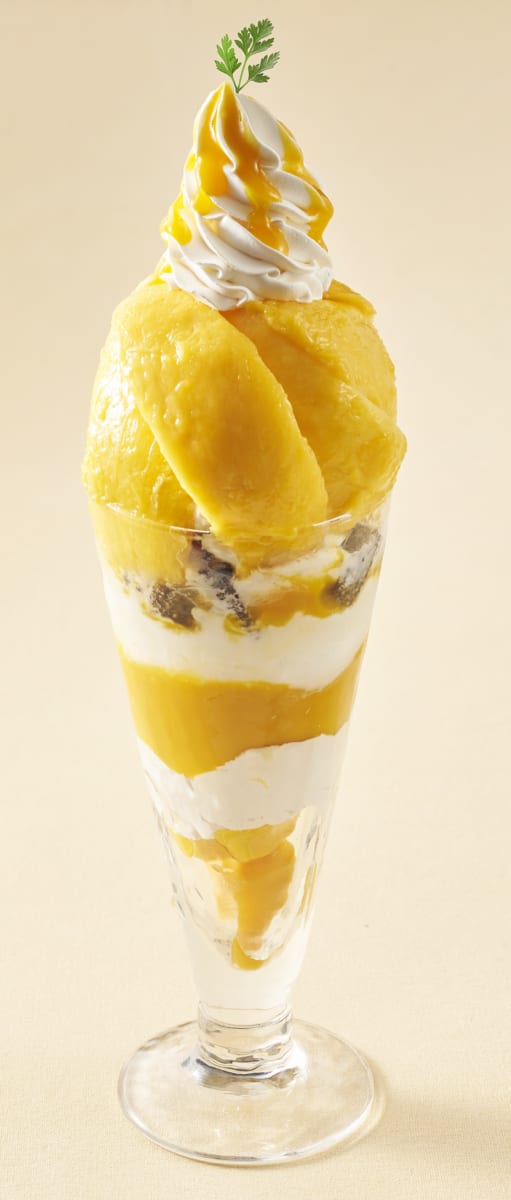 目玉商品は、マンゴーを贅沢に2個分トッピングした、全長30cmのタワーパフェ!