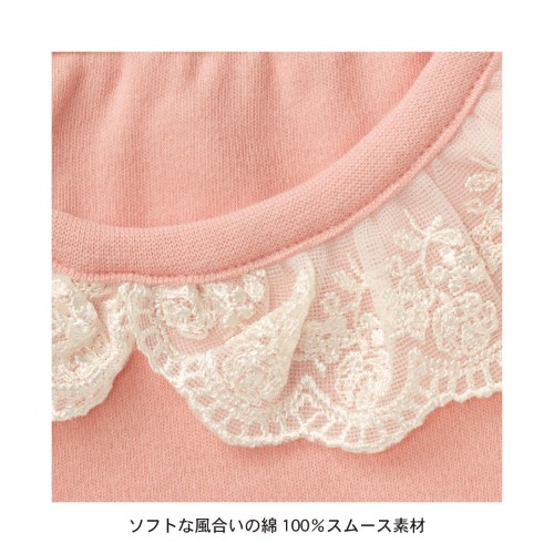 後ろ側まで丁寧に配したリアルレース襟や裾のフリルが乙女心をくすぐる、キュートなパジャマ。