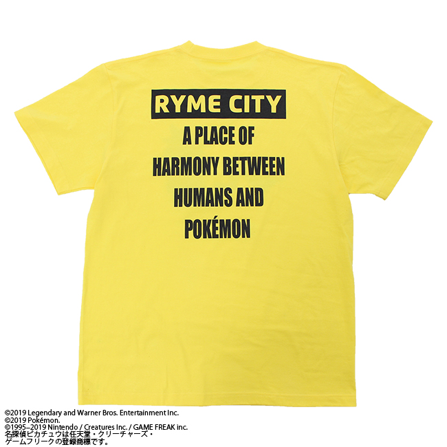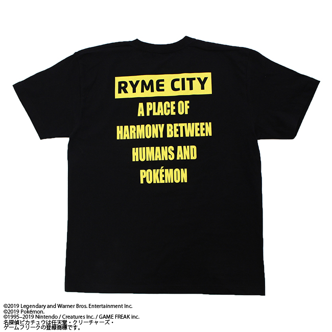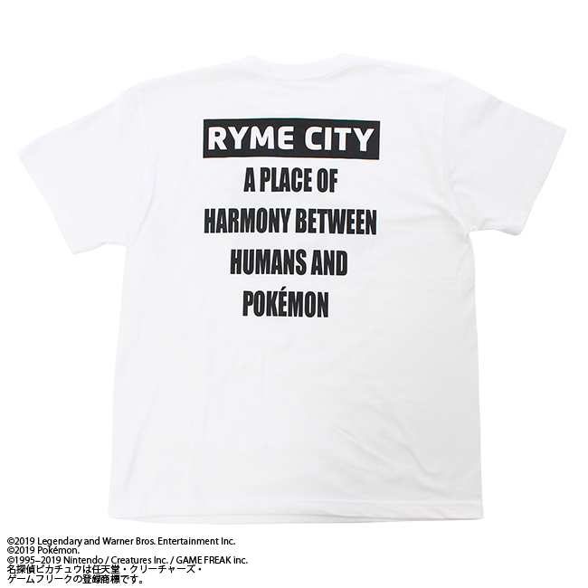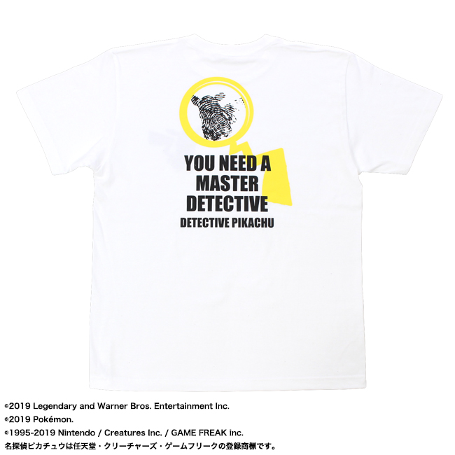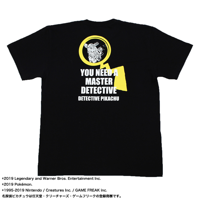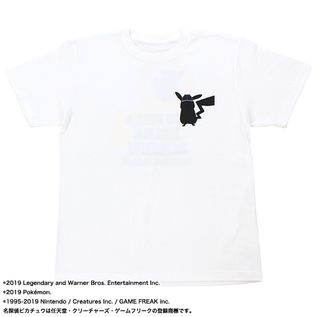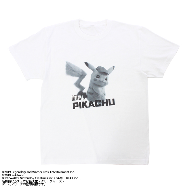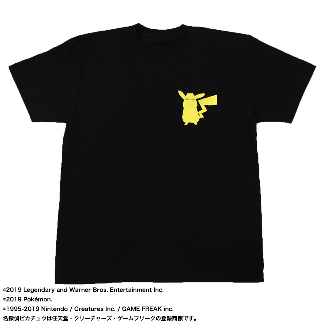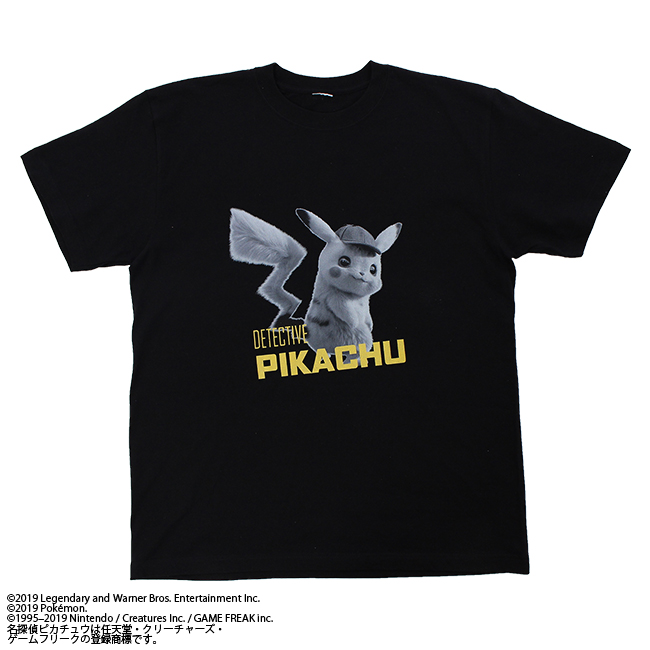 「名探偵ピカチュウ」のモノクロアートがフロントに配置されたTシャツ。