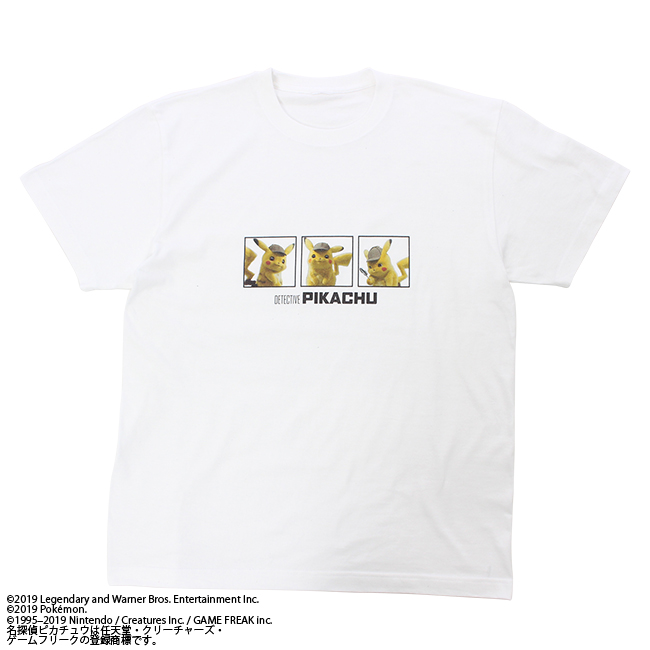 胸元に配置された3つのボックスの中に「名探偵ピカチュウ」がデザインされたTシャツ。