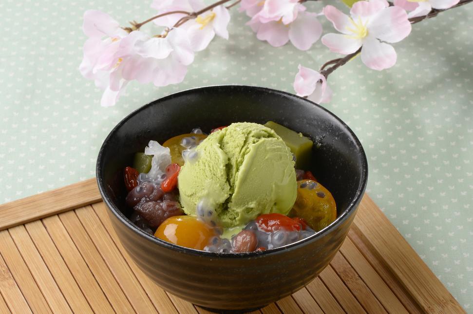 宇治抹茶を使用した特製葛もち、抹茶アイス、大納言小豆、金柑のコンポート、白きくらげ、クコの実、山粉圓(サンフンウェン)をアジアンあんみつに仕上げた一品。