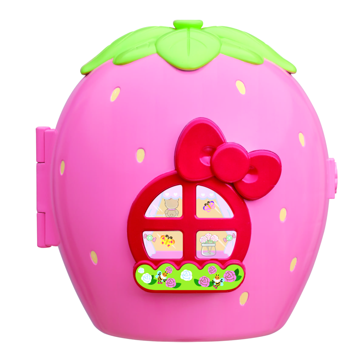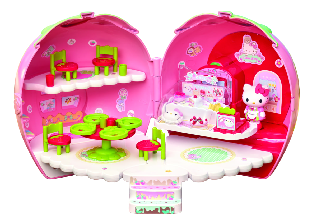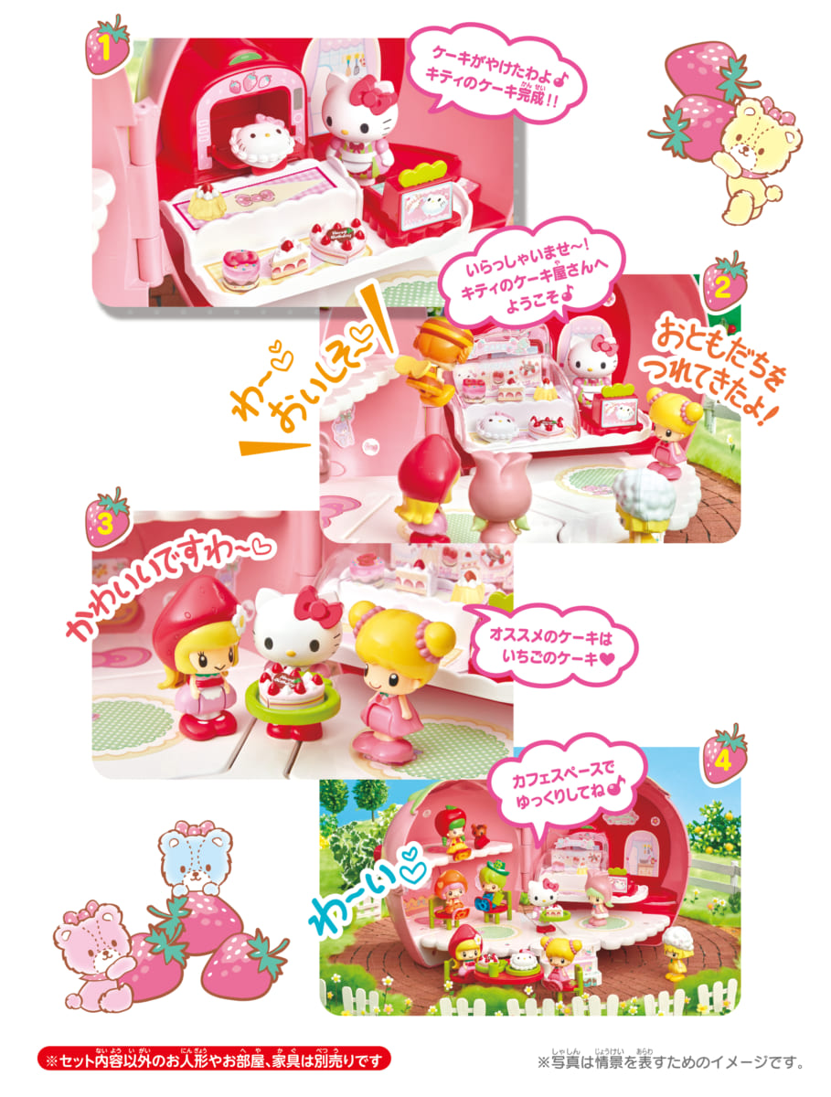 「お店やさんごっこ遊び」が楽しめる可愛いいちごの形をしたハウスになっており、おしゃべりする店員さんデザインのキティちゃんやハローキティをモチーフとしたケーキなどが付属されています。