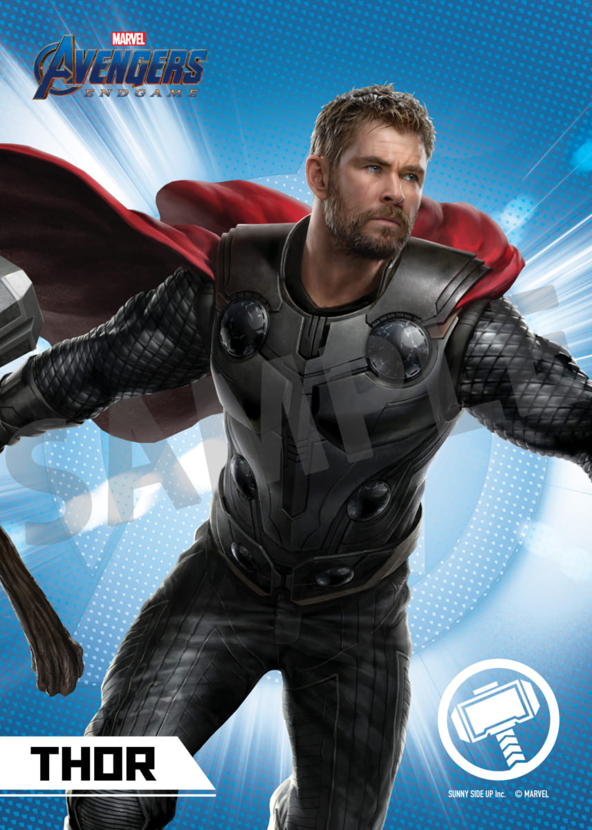 深紅のマントをなびかせ、武器を持つ姿がデザインされた「ソー」