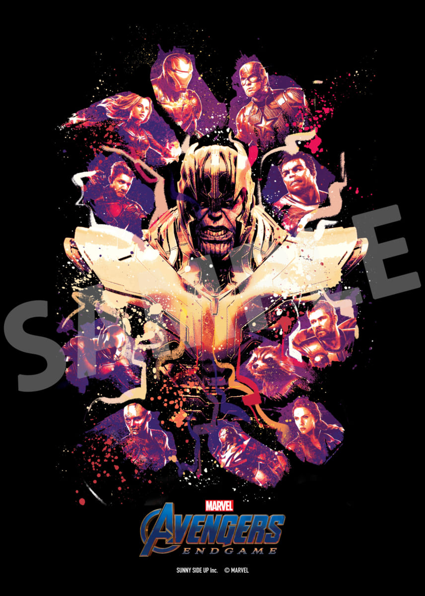 中央に険しい表情の「サノス」を配し、それを囲むように「アベンジャーズ」11ヒーローが落とし込まれたアート