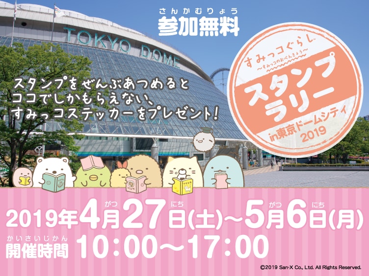 東京ドームシティゴールデンウィークスタンプラリーイベント「すみっコぐらしスタンプラリー in 東京ドームシティ」が、2019年4月27日(土)から5月6日(月)まで、東京ドームシティにて開催されます。