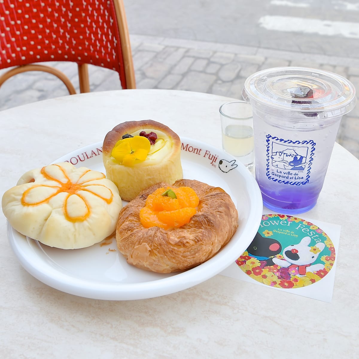 テラス席も用意されたおしゃれなカフェでは、「フラワーフェア」にあわせた、お花モチーフのパンを提供。