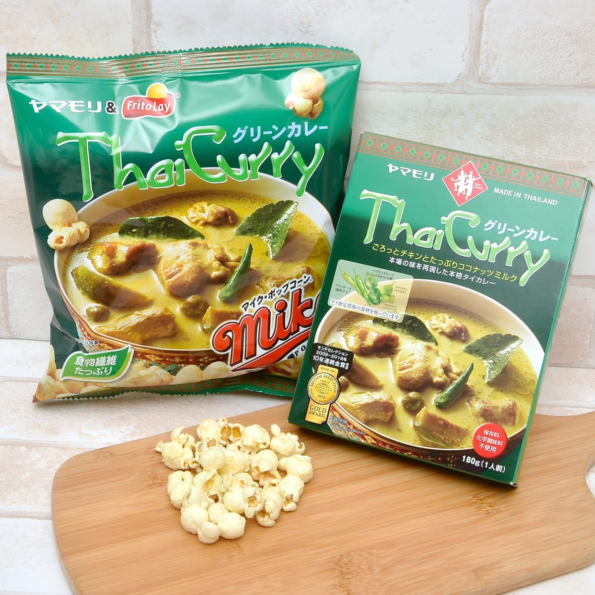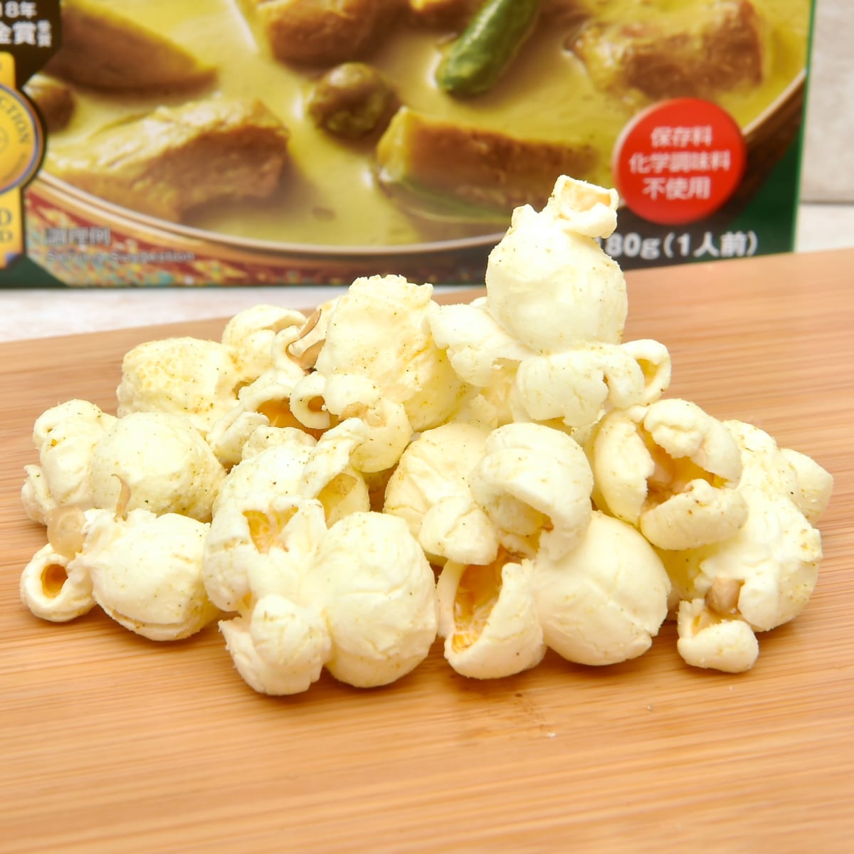 レトルトカレーとは思えないヤマモリの「タイカレー グリーン」で味わえる本格的な味わいが、そのままポップコーンで味わうことができます。