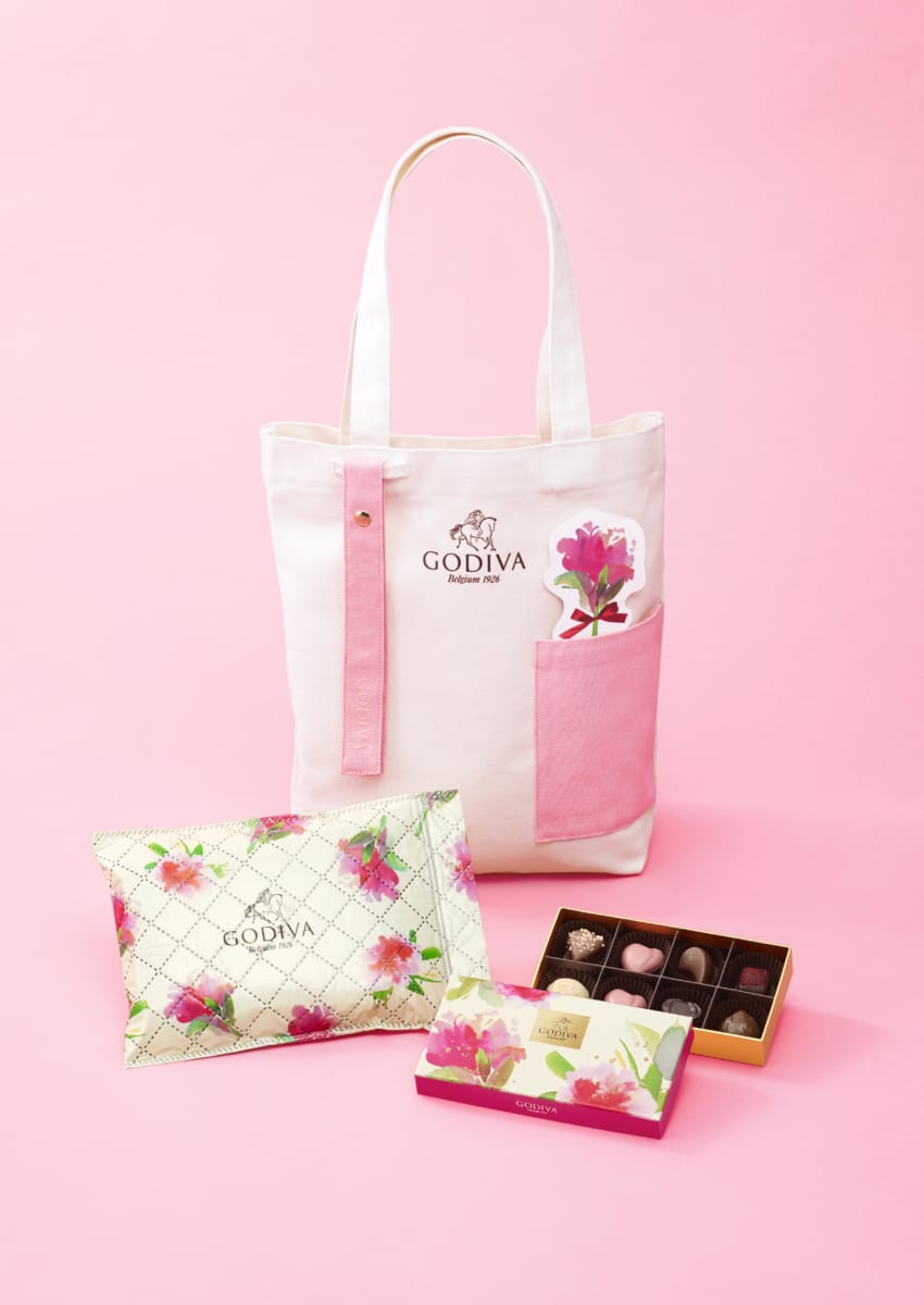 「ゴディバ クール ローズ アソートメント」に、オリジナルメッセージカードと保冷バッグ、そしてゴディバのロゴ入りトートバッグがセットになった限定商品。